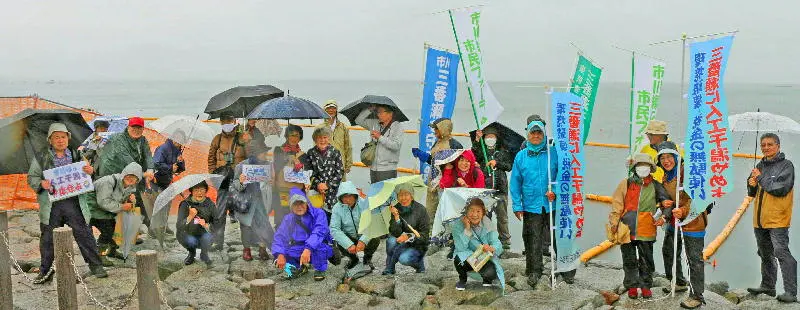 三番瀬は東京湾奥部に残った貴重な干潟・浅瀬である。市川市は、「市民が海に親しめるようにするために人工干潟をつくる」を掲げ、航路に堆積した真っ黒いヘドロを三番瀬の一部に投入している。三番瀬保護団体は5月31日、市川市の人工干潟造成計画中止を求めるアピール活動を現地でおこなった。雨の中、30人が参加した。