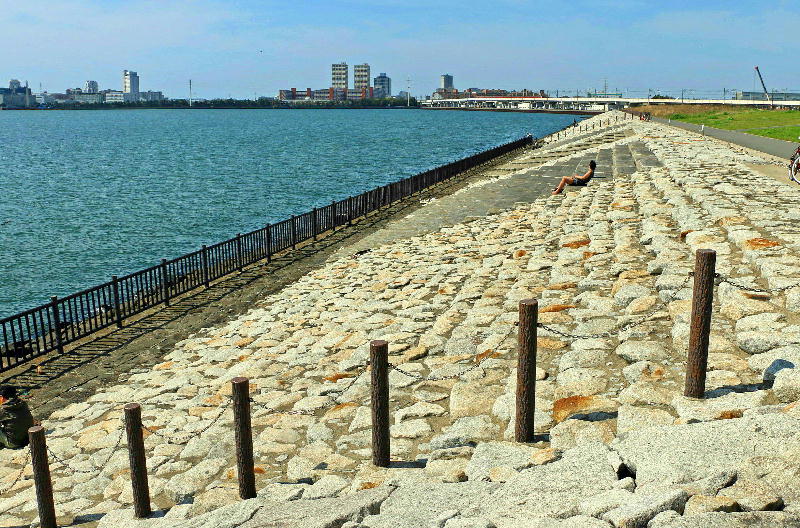 しかし塩浜地区は、2000年7月の台風で護岸沿いの20か所が陥没した。翌2001年9月の台風でも11か所の大規模な路面沈下と陥没が発生するなど、崩壊の危険性が高まった。そのため県は、2004年度以降、約39億円の巨費を投じて頑丈な石積み護岸を建設した。護岸改修に用いる石は三重県から搬入した。