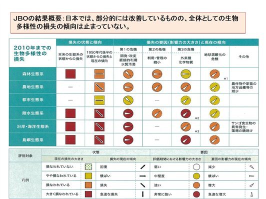 GBO3の公表と時期を一にして、日本の生物多様性の現状と傾向を評価した「生物多様性総合評価(Japan Biodiversity Outlook)」の結果が公表されました。2010年までの生物多様性の損失状況について森林、農地、都市、陸水、沿岸等の生態系ごとに評価を行った結果、全体として生物多様性の損失は止まっていないことが示されました。(図1)