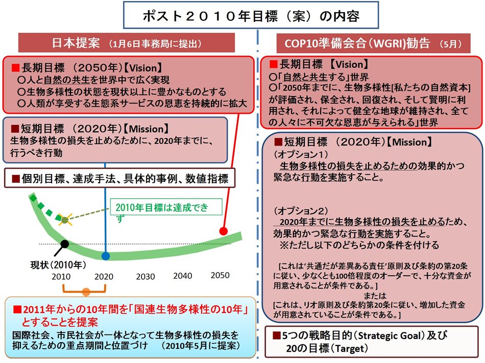 GBO3の結果を踏まえて、COP10では、「意欲的かつ現実的で、計測可能」なポスト2010年目標の策定が強く求められています。日本は、議長国として議論を積極的にリードしていくため、研究者やNGO等との意見交換やパブリックコメントを経て、本年1月に日本提案を取りまとめ、事務局に提出しました。