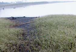 排水の影響? ハママツナ壊滅状態温泉施設、ホテルの排水は合計日量1000トンに達します。その影響と思われることが、アサリ、バカガイ、海苔、魚、底生植物などに現れ始めています。アサリ、バカガイの収量は激減し、海苔も収量が減少しています。環境省が調査対象としているハママツナ群落は、既に群落ではなくなり、昨年段階でほぼ3カ所に数平方メートル単位で散見するまでになりました。特に昨年からの減少は著しく、本年1月からの追跡調査でも種は周辺に落ちて発芽はしてもそれから先が育たなくなっています。今年5月に入ってから3カ所のうち1カ所は1本もなくなってしまいました。全滅が近づいていると危惧します。同じことが底生植物のシオクグにも現れており、既に30パーセントは根腐れでなくなりました。現在、かろうじて生きているものも先端がほとんど枯れており元気がありません。弱いものから影響を受けていると考えられます。