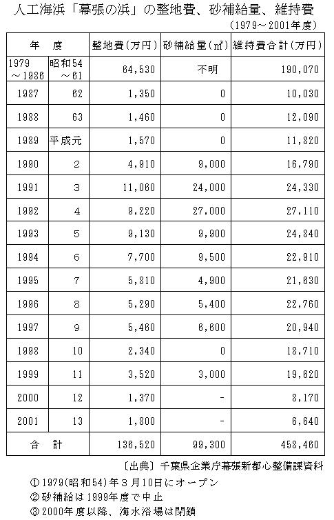 「幕張の浜」の砂補給と整地に要した費用は1979~2001年度の23年間で45億8000万円に上る。それでも侵食が止まらないため、県はとうとう砂補給を1999年度で中止した。利用者の安全を確保できないとし、海水浴や水浴びも禁止した。